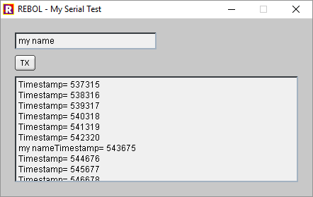 It seems to me that in Rebol you have to tell what your COM port is, create a "serial thing" (named "ser" in the example below) and configure it. Then, to send messages to serial, you insert your messages in this "thing", and to read what is received, you copy , pick or first this "thing".