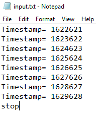 The example below sends what it receives in COM7 at baud 9600 to file "input.txt" until it receives a ctrl-z. It creates the file automatically or appends an existing file. The Arduino sketch above sends a ctrl-z every now and then, so your output may be longer or shorter: