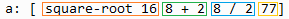 >> a: [ square-root 16 8 + 2 8 / 2 77]