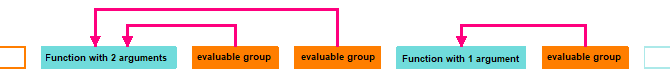 A function takes its arguments from the evaluable groups ahead of it, from left to right (think of infix operators as syntax sugar for their function counterparts). A function that needs 1 argument, take the next evaluable group; a function that needs 2 arguments, take the next 2 evaluable groups, and so on. Notice that a function may use an evaluable group that has another function in it. In this case, it holds its evaluation until the argument function is evaluated, and then use the result.