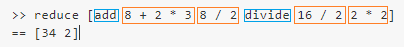 >> reduce [add 8 + 2 * 3 8 / 2 divide 16 / 2 2 * 2]