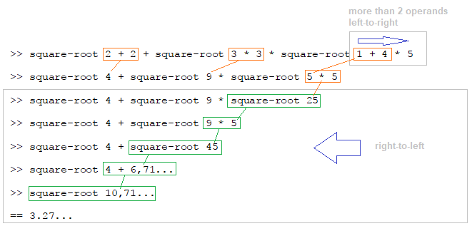 1- All operations with infix operators that have only values (not functions) as operands are evaluated first. If these infix expressions have more than two operands they are evaluated from left to right ( → ) with no precedence (i.e., multiplication doesn't automatically get computed before addition) .