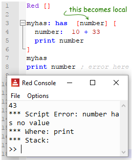 If your routine uses no external arguments but has local variables, use the word has. has turns the argument into a local variable. Compare the three programs below. The first uses has with no argument, hence "number"is a global variable. The second gives "number" as argument, making it local. And the third shows that a function with argument need that argument to be sent by the calling event.