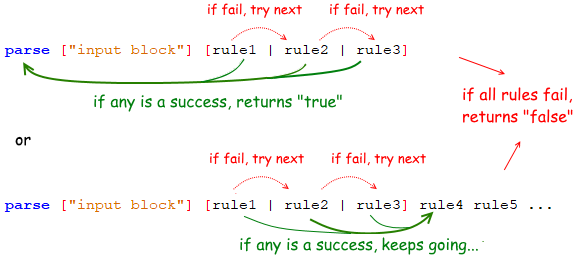 If a block of rules separated by "|" is found by parse, it will try each rule, from left to right until it finds a match, returning success and going to the next rule after the block. If none of them is a match, of course, it fails and the parsing is stopped returning false.