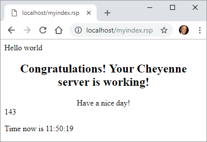 With Cheyenne running (listening to default port 80), type localhost/myindex.rsp on your browser's address bar. You should get this: