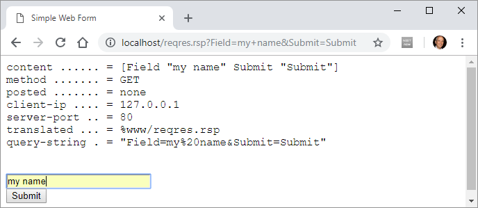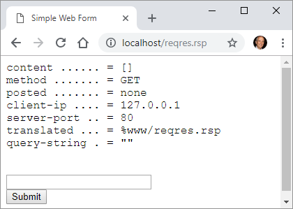 With Cheyenne running (listening to default port 80), type localhost/reqres.rsp on your browser's address bar. You should get this: