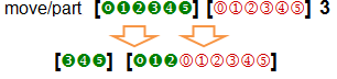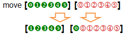Moves one or more elements from the first argument into the second argument. Changes both original arguments.