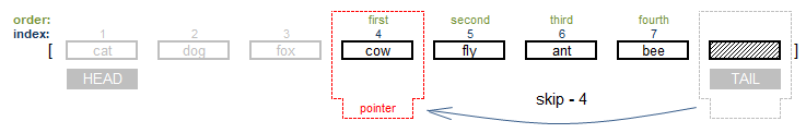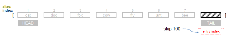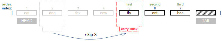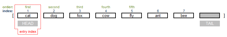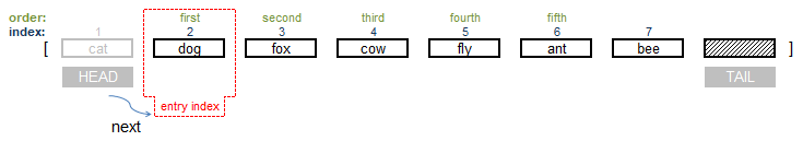 Note: I made up the name "entry index". It is not in the documentation. I have seen the "entry index" being called just "index", but I dislike that, as it may cause confusion with the index number of the elements. It is a somewhat subtle concept. Novvorto @novvorto_twitter suggest it should be called "first index" since this index always points to the element returned by first command, noting that head index will always be 1. This makes sense, and I may change it in the future.